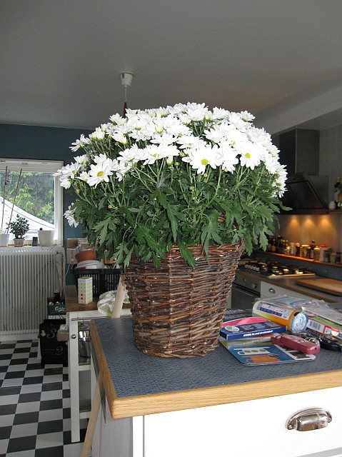 Hokan började med golvet i badrummet på bottenvåningen. Linoleumplattorna ska bort och det ska limmas på spån så att det blir OK att göra badrumsgolv på. Ulrica städade och fixade lite med blommorna.